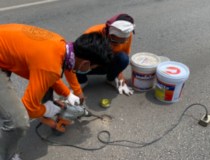- เจาะรูบนตำแหน่งที่ต้องการจะติดตั้ง ให้มีรูขนาดใหญ่กว่าวัสดุที่จะติดตั้งเล็กน้อย เพื่อให้กาวที่ใส่มีพื้นที่ให้ยึดเกาะระหว่างหมุดกับพื้นถนน และในรูที่เจาะ